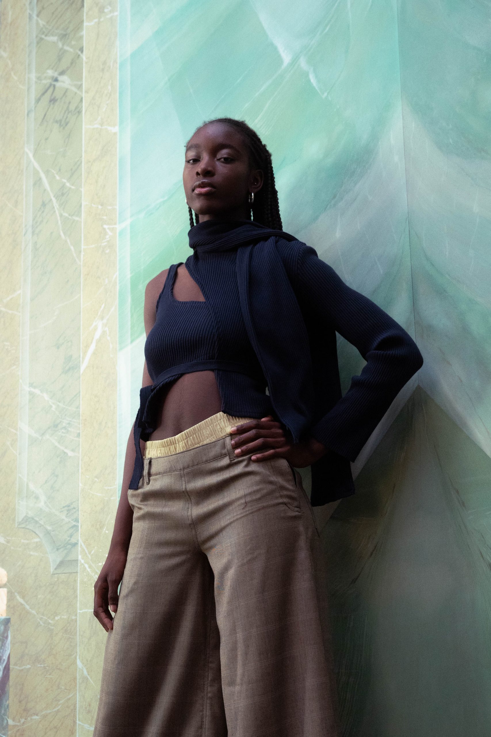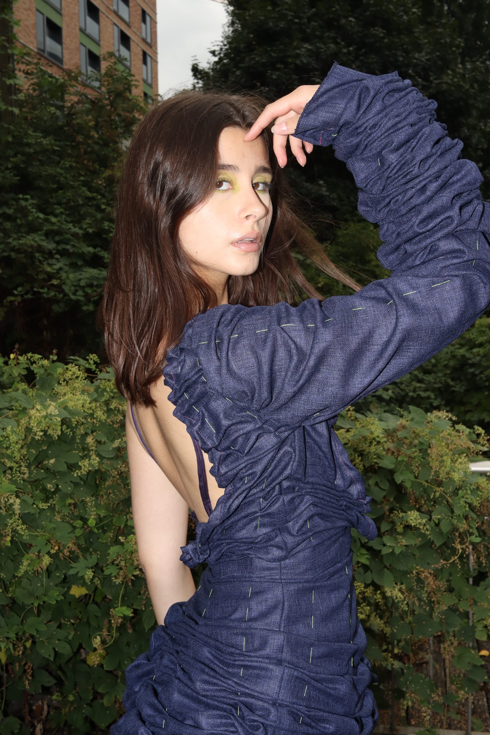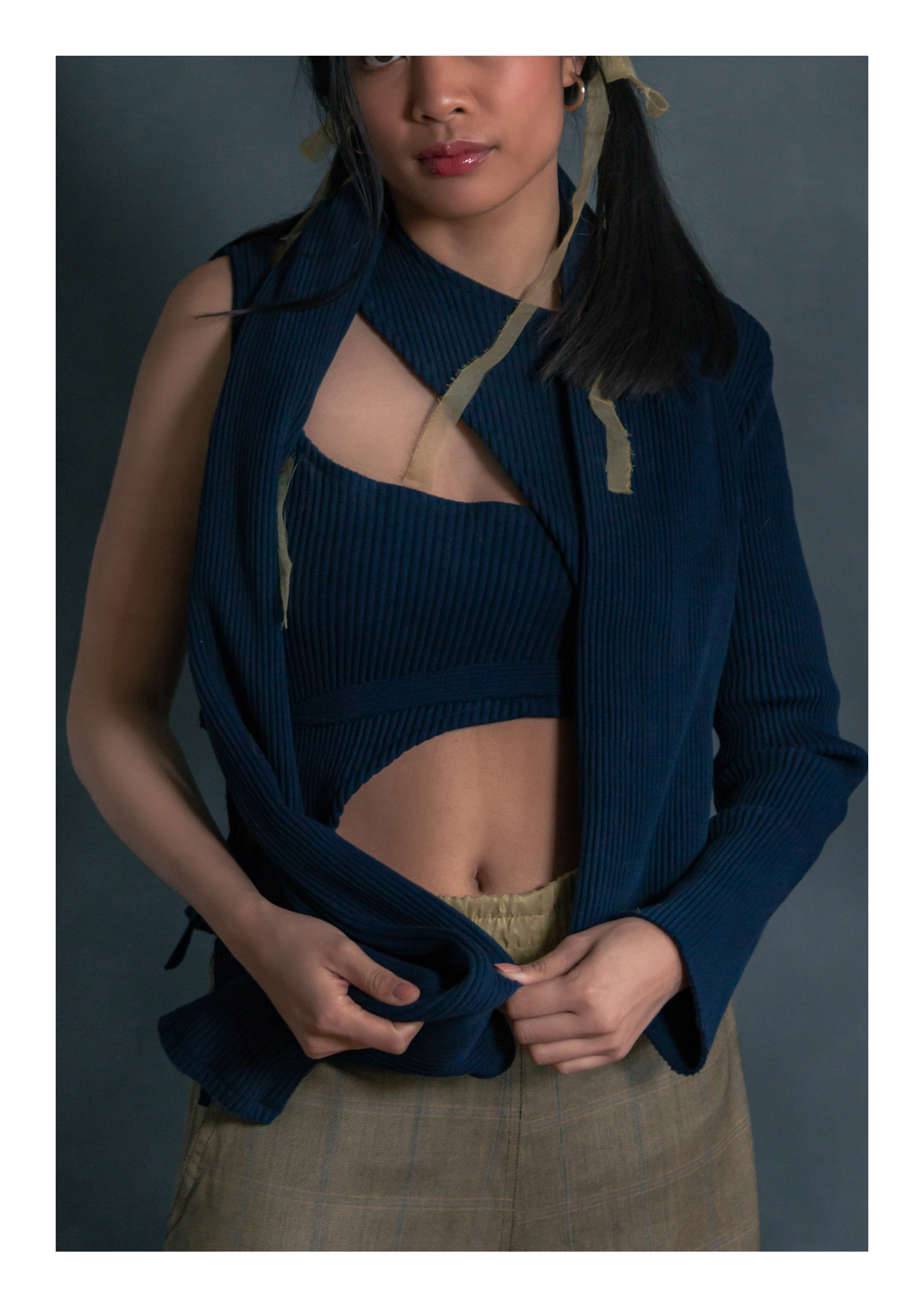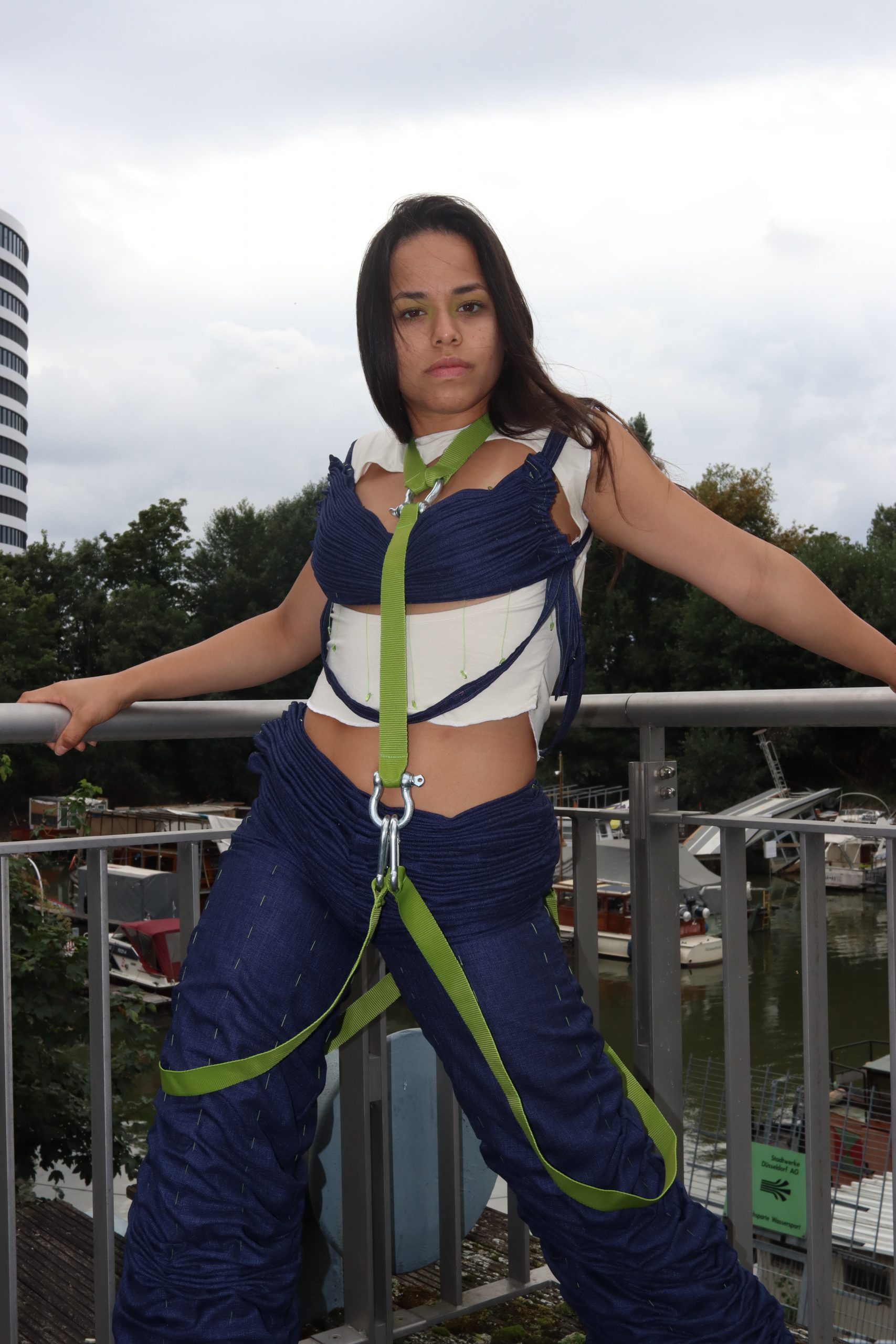 In her collection titled ‘The Green Flash,’ Emma Bassols found inspiration in the old sailor’s tale of a green flash appearing on the horizon as the last rays of the sun flicker over the open sea. Growing up in a sailing environment, Bassols sought to capture the essence of sailing attire, the color palettes, and the shapes of the ocean in her designs. The collection’s color palette draws from the hues of the ocean and skies during sunset and dawn, featuring blues, purples, and hints of green that echo the tale that inspired her. She wanted to be able to incorporate elements like harnesses in this collection, since they are an elemental piece for sailors safety at sea, drawing inspiration from her own experiences spending hours wearing them. In “The Green Flash” she also explored new fabric manipulations to mimic the weaving patterns of the open sea.