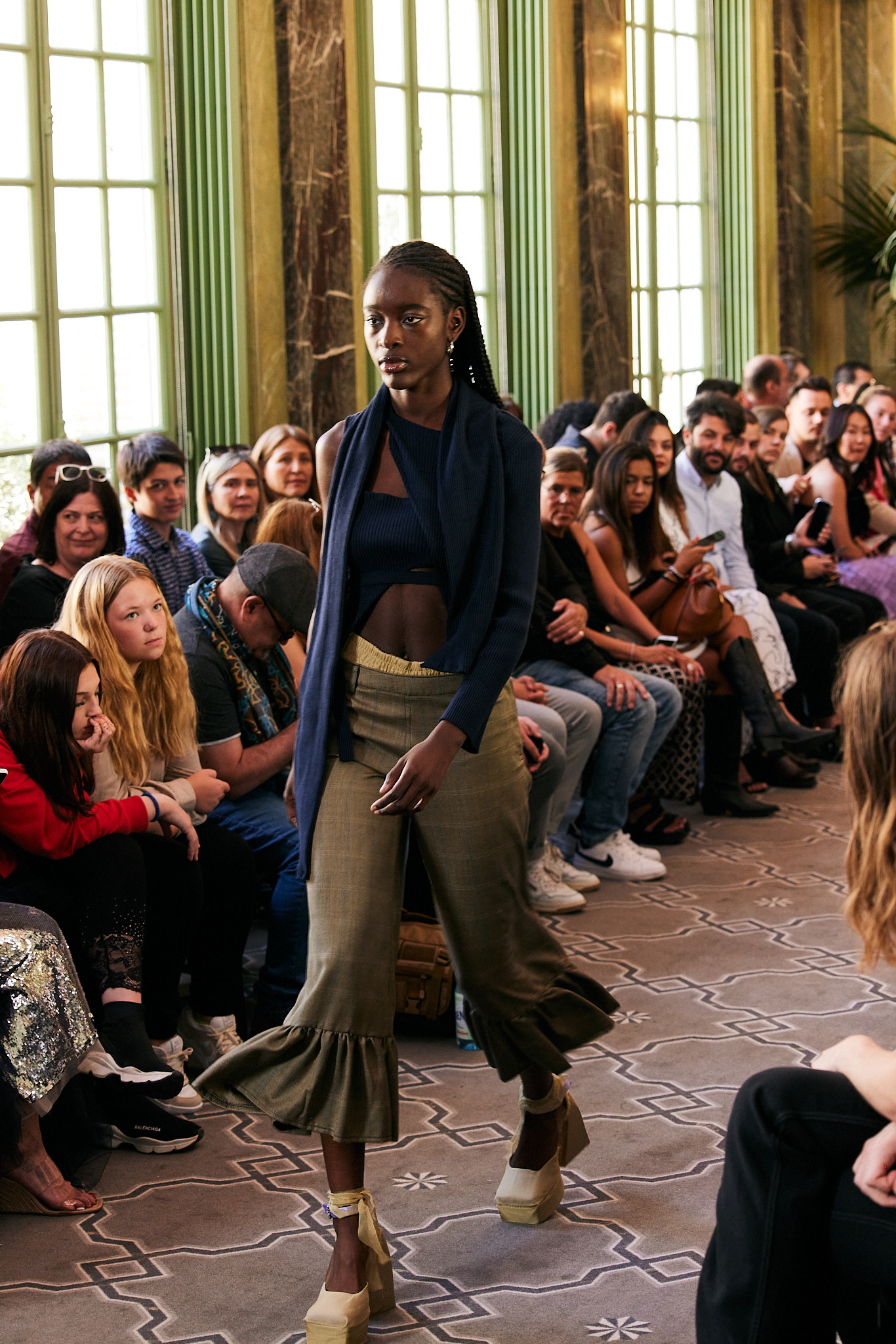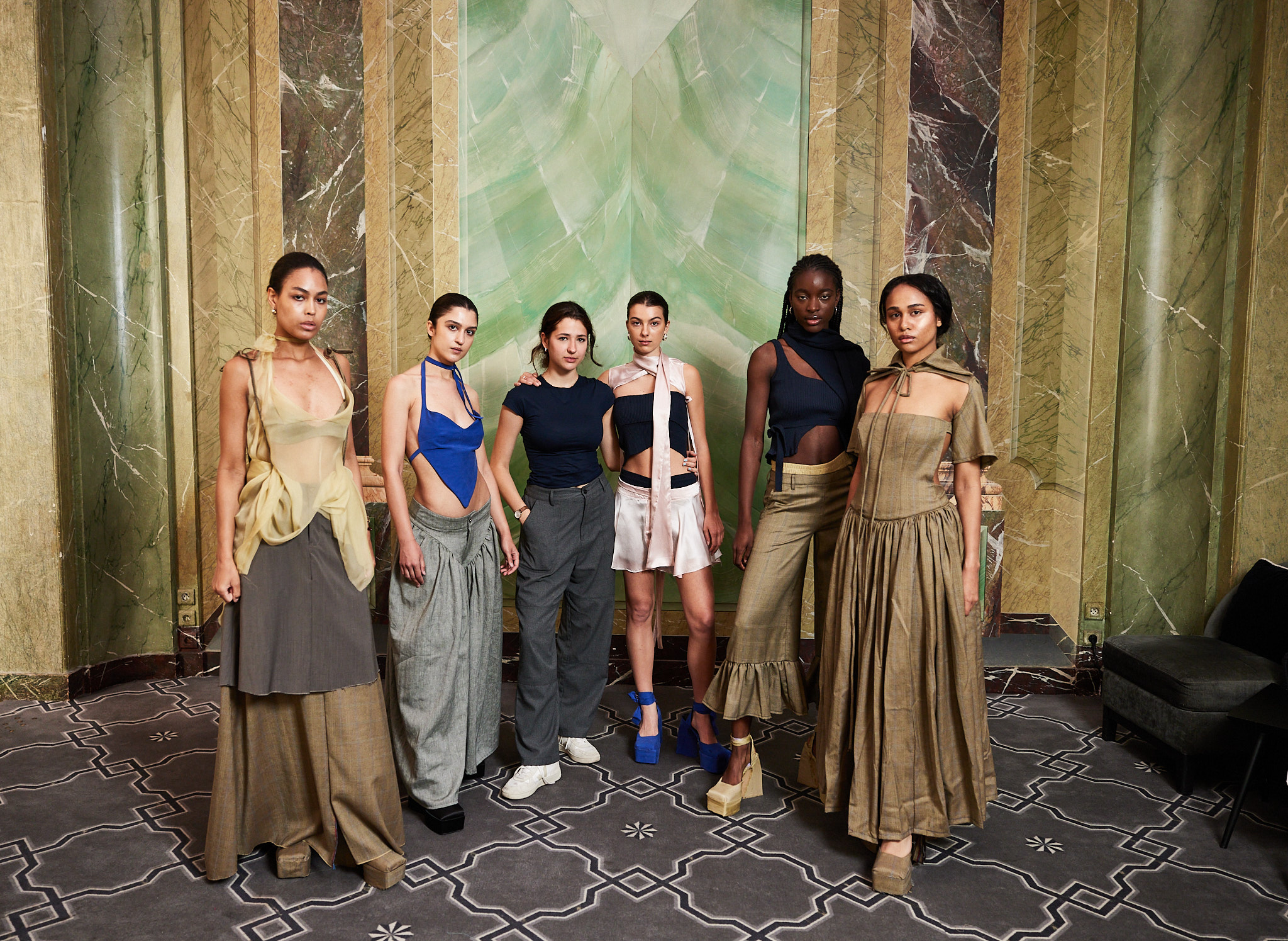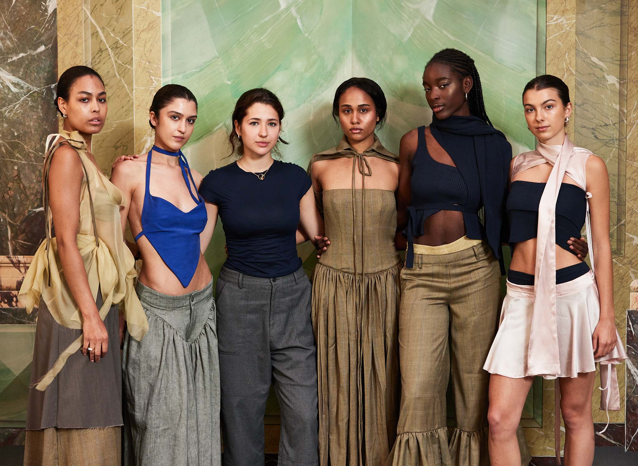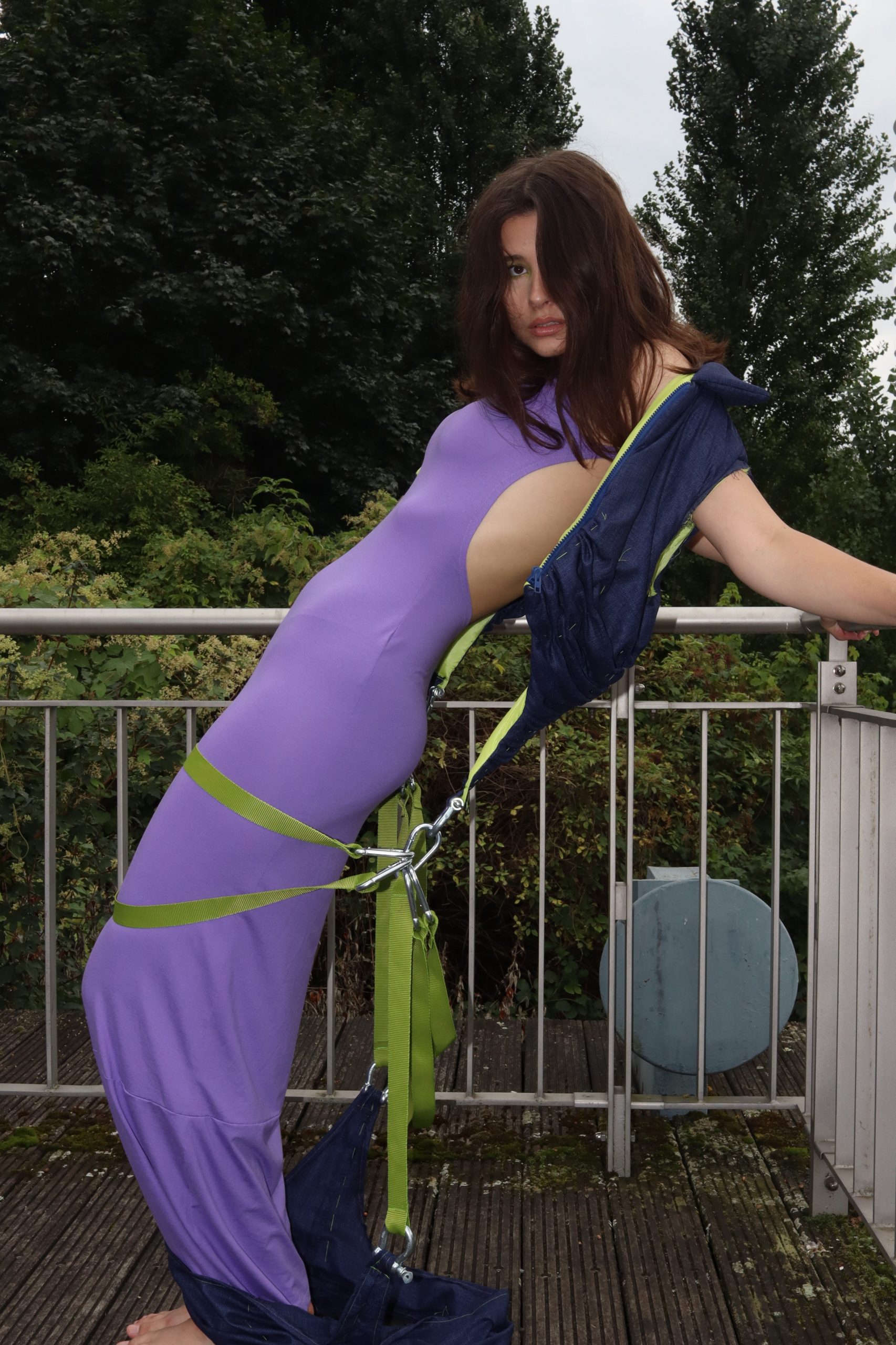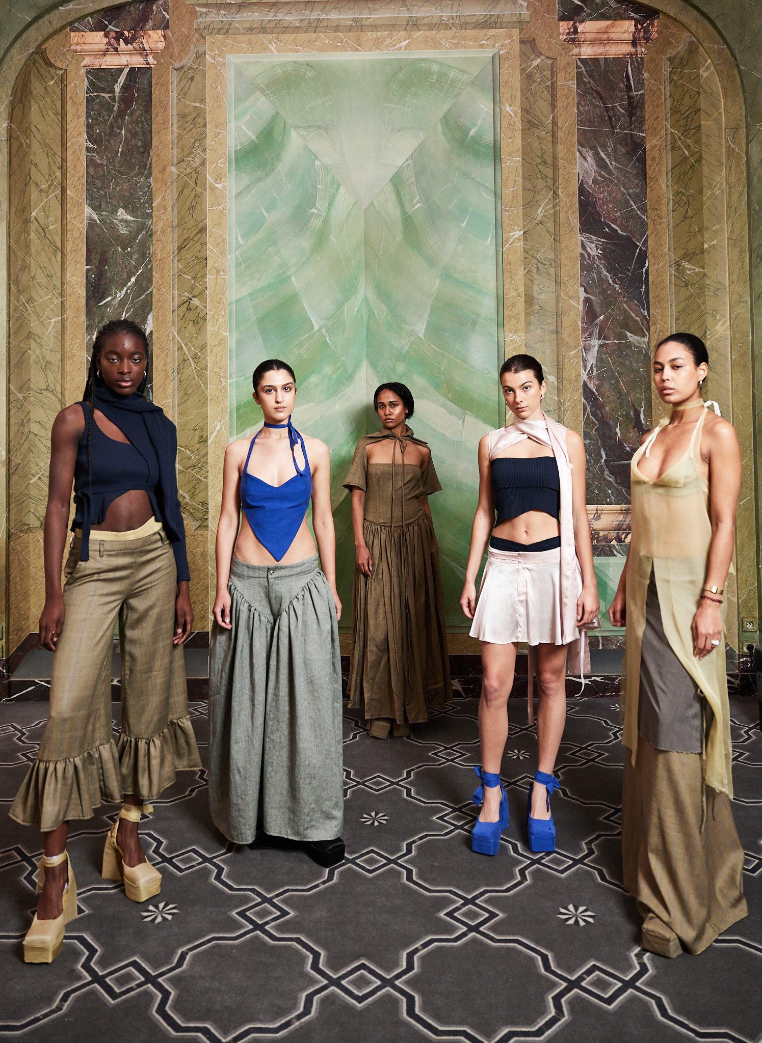 In her collection titled ‘The Green Flash,’ Emma Bassols found inspiration in the old sailor’s tale of a green flash appearing on the horizon as the last rays of the sun flicker over the open sea. Growing up in a sailing environment, Bassols sought to capture the essence of sailing attire, the color palettes, and the shapes of the ocean in her designs. The collection’s color palette draws from the hues of the ocean and skies during sunset and dawn, featuring blues, purples, and hints of green that echo the tale that inspired her. She wanted to be able to incorporate elements like harnesses in this collection, since they are an elemental piece for sailors safety at sea, drawing inspiration from her own experiences spending hours wearing them. In “The Green Flash” she also explored new fabric manipulations to mimic the weaving patterns of the open sea.