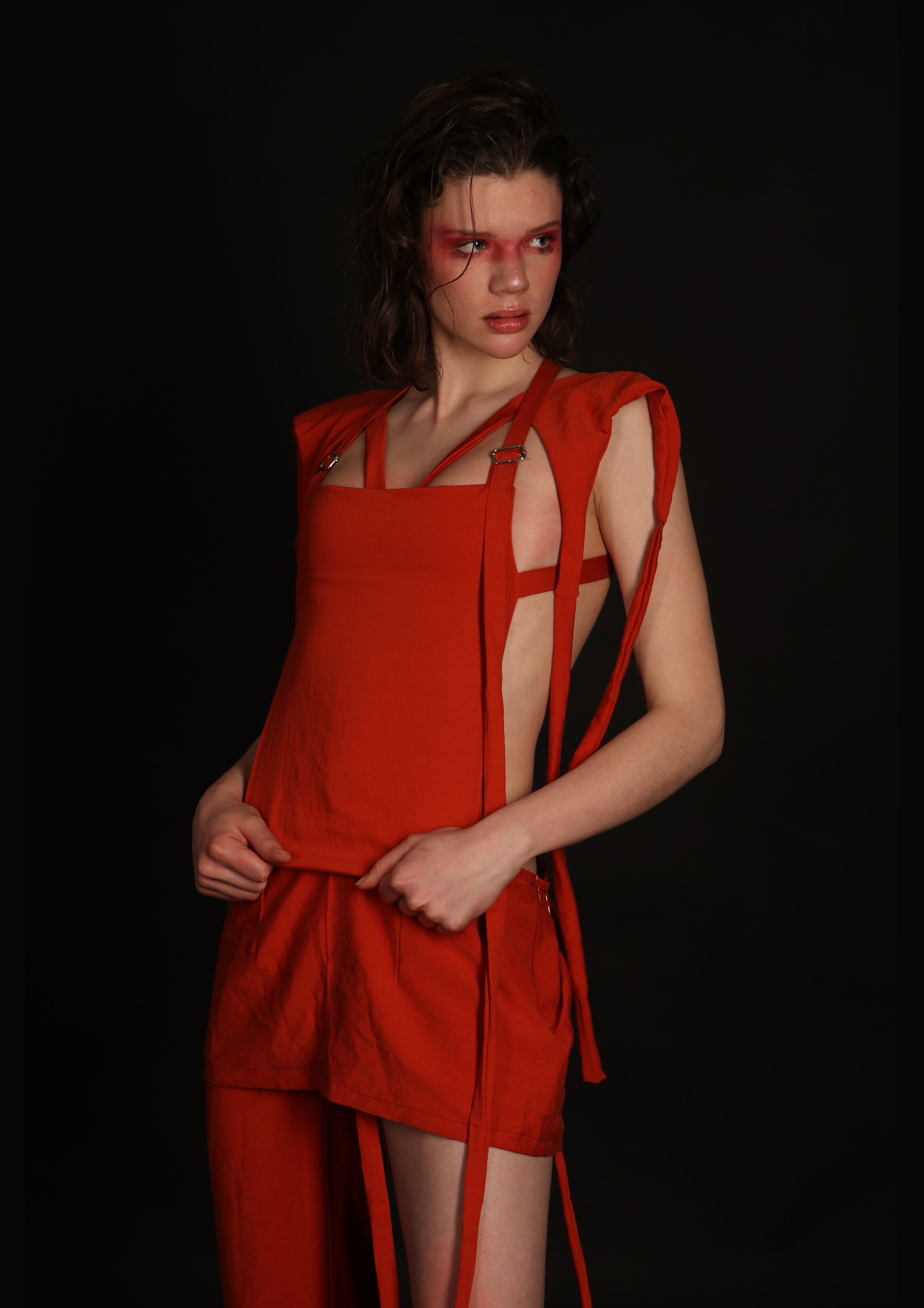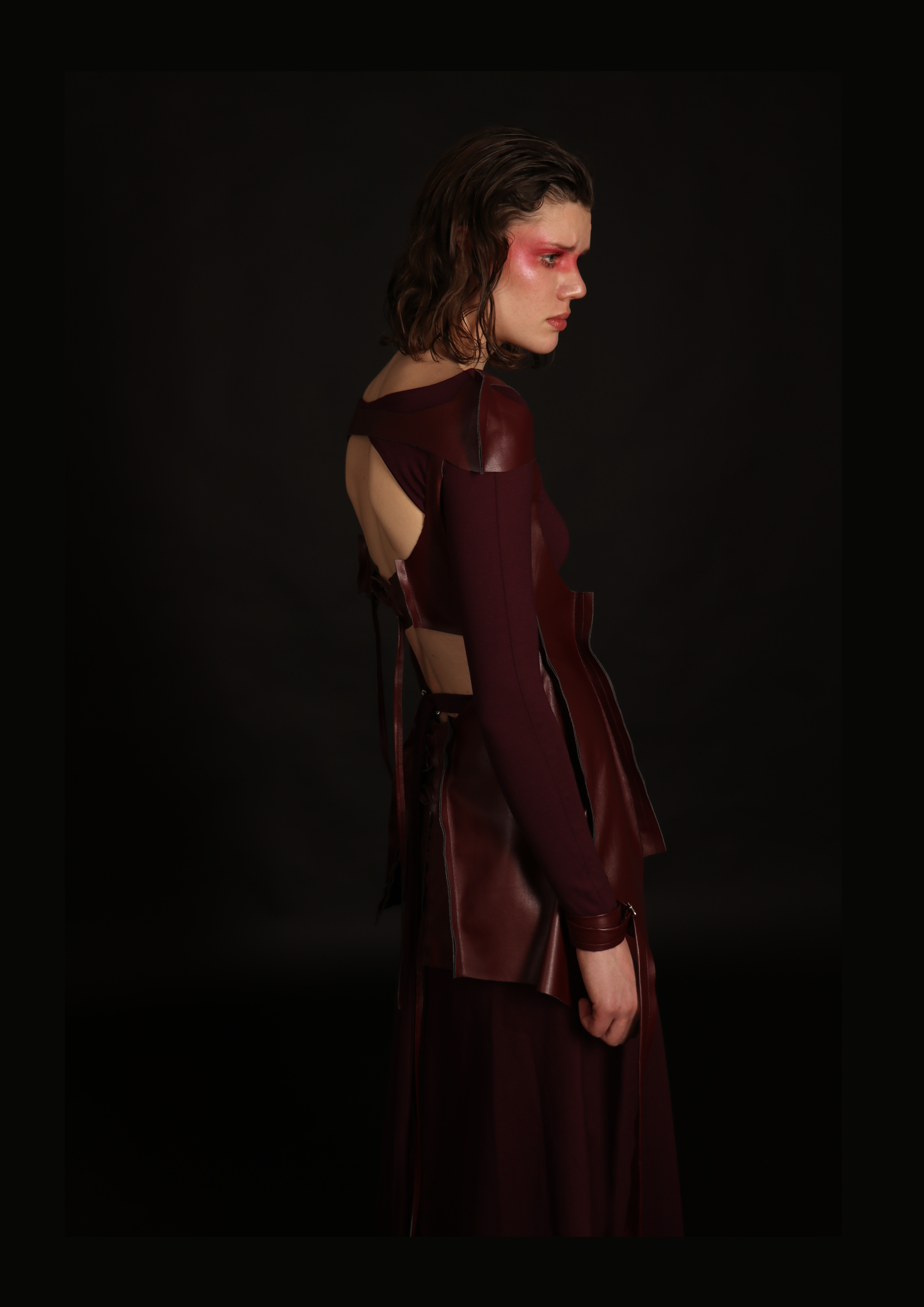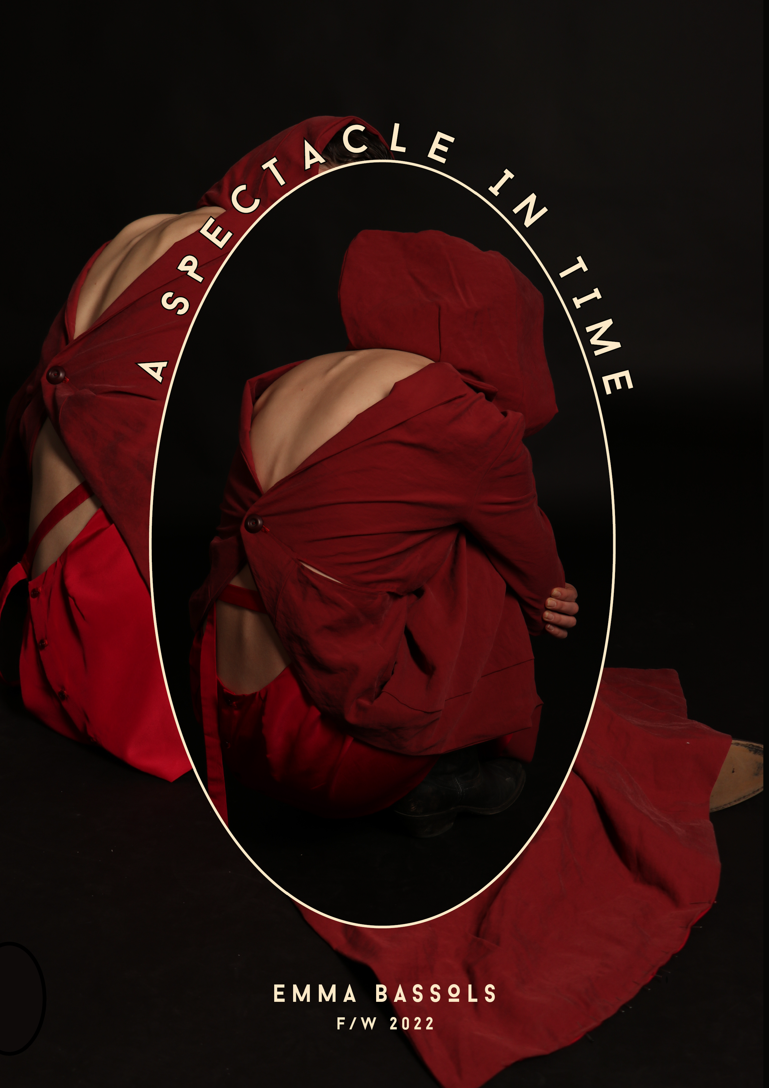 In ‘A Spectacle in Time’ Emma Bassols delves into the diverse dynamics of women in contemporary society, capturing the essence through five distinct characters, each struggling with the relentless passage of time. In this collection she wanted to explore her creative pattern-making skills, as well as a variety of fabrics and textures, carefully chosen to symbolize the diverse characters and personalities that served as inspiration. The color palette with the delicate bright pink, coarse orange and mahogany, and the burgundy synthetic leather mirrors a fusion of colors and textures, drawing inspiration from flames and its residues.