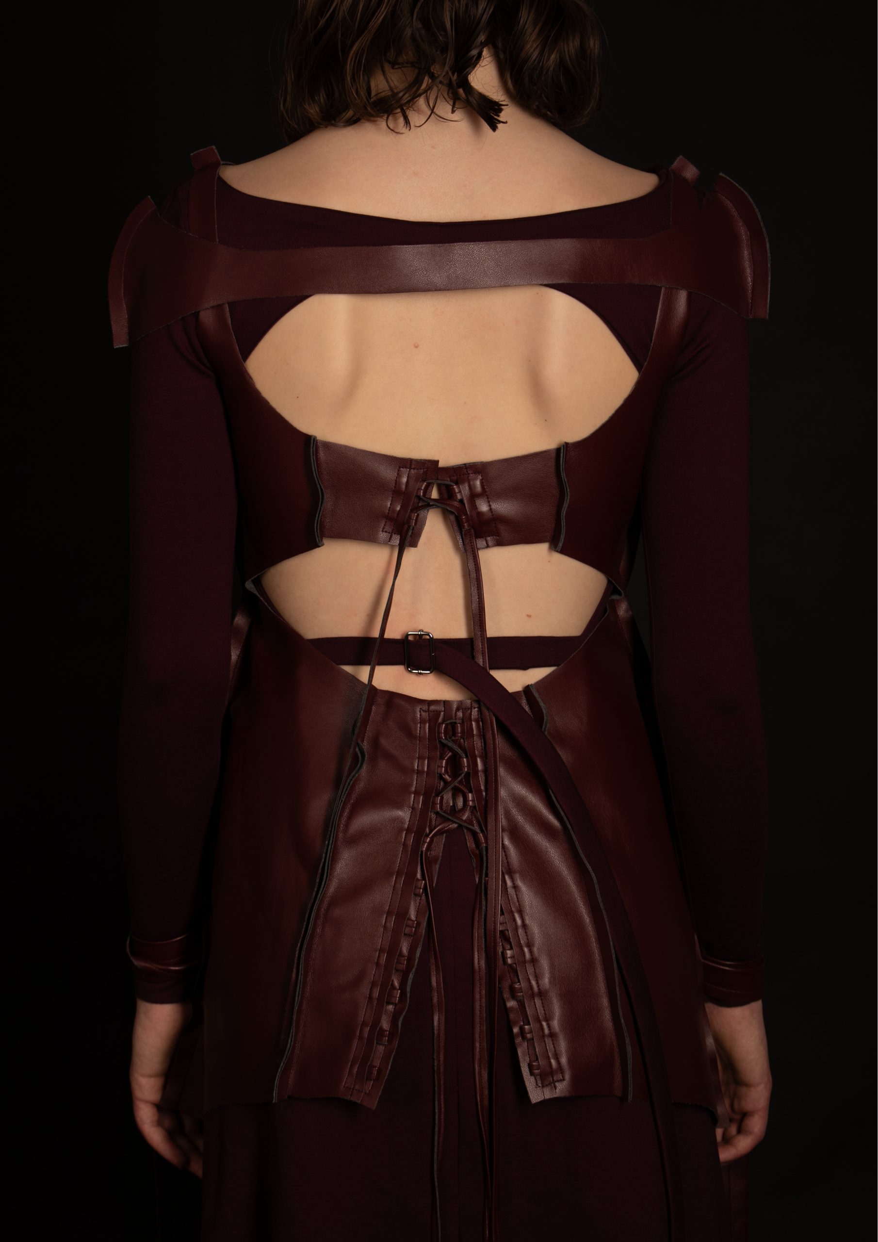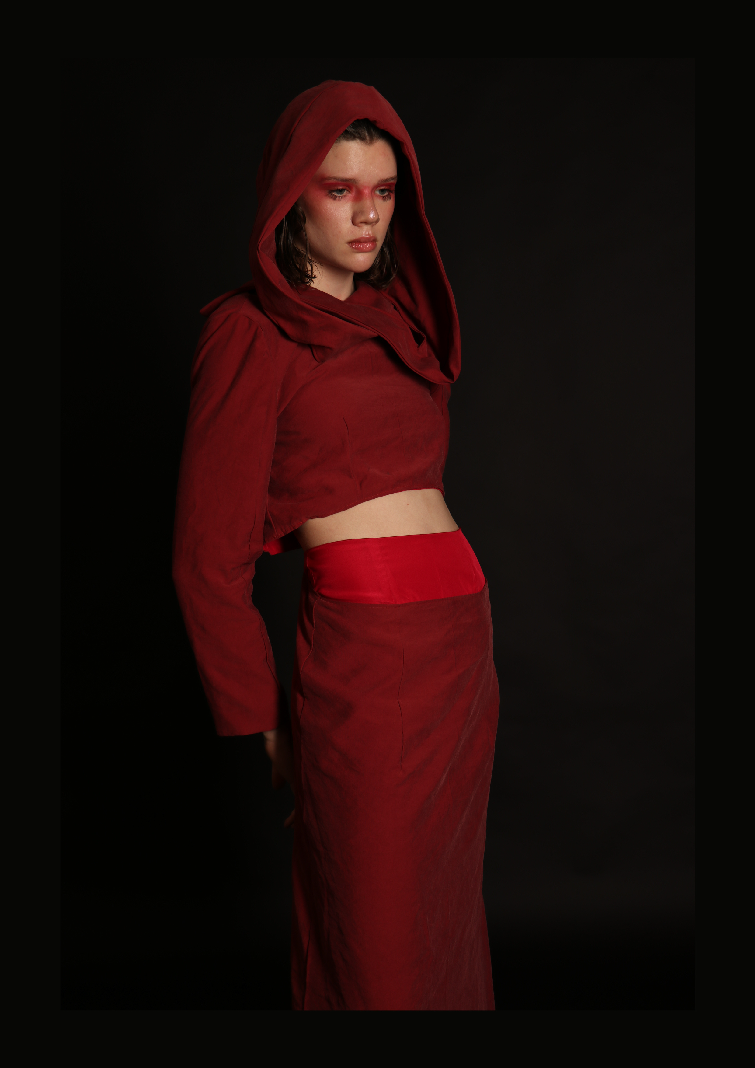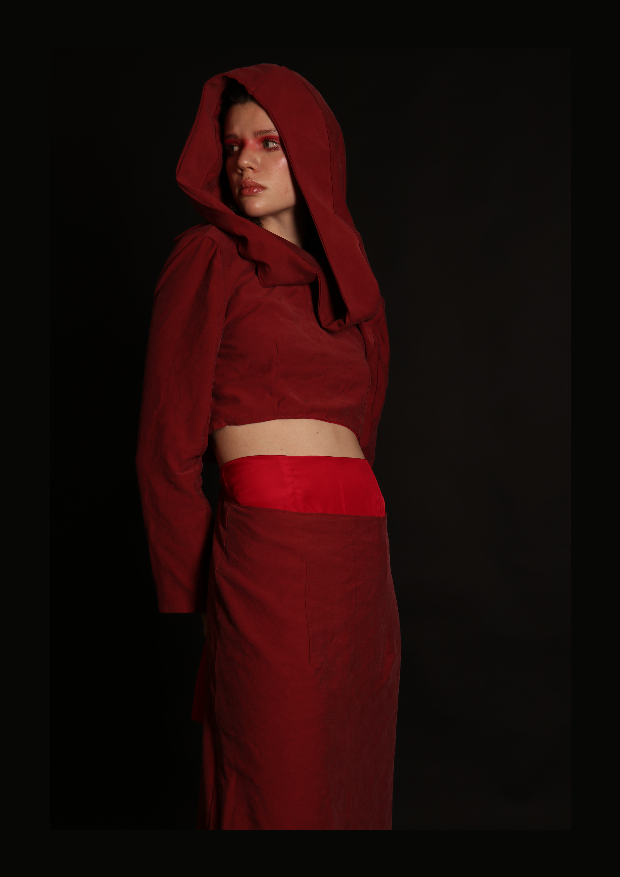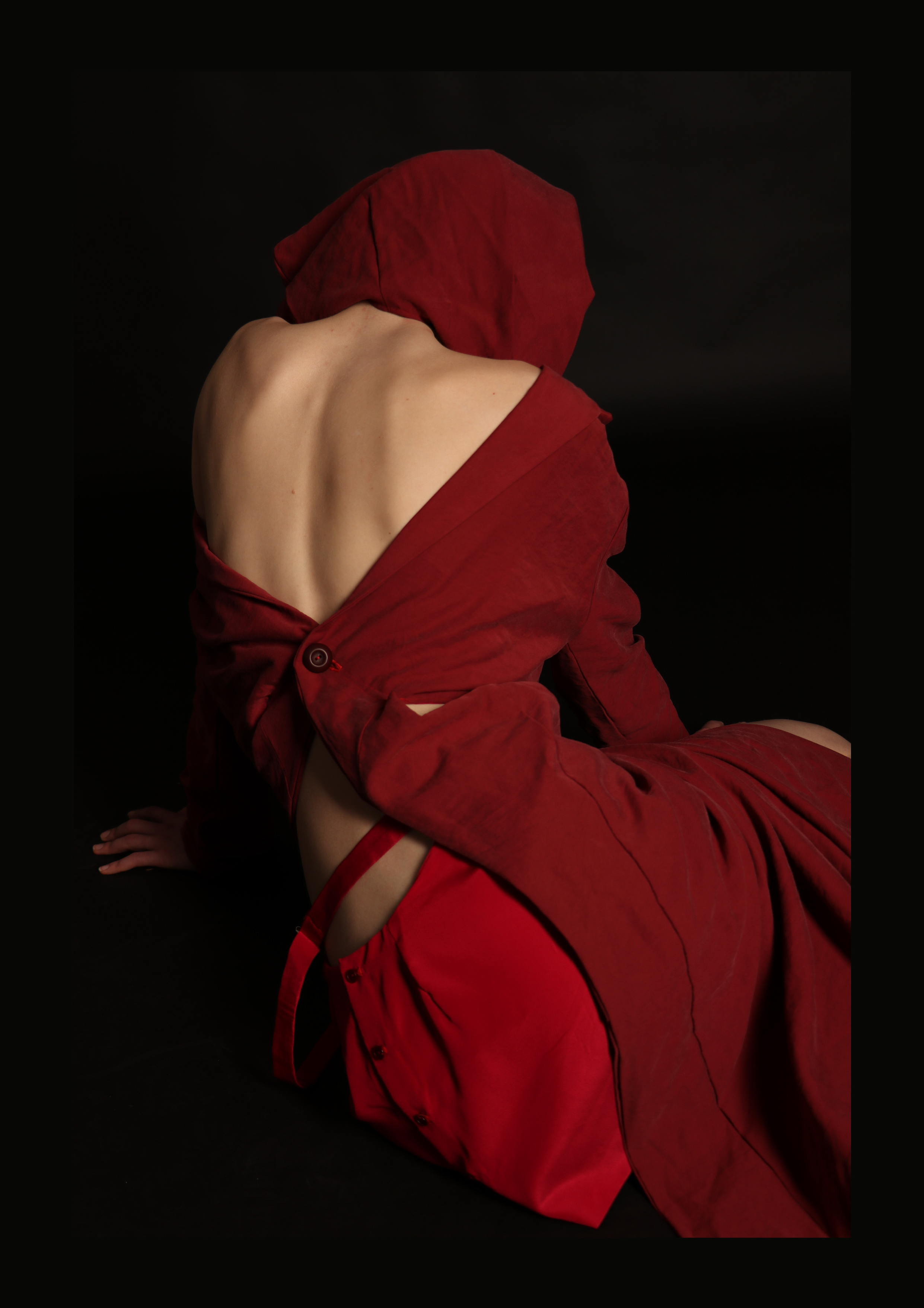 In ‘A Spectacle in Time’ Emma Bassols delves into the diverse dynamics of women in contemporary society, capturing the essence through five distinct characters, each struggling with the relentless passage of time. In this collection she wanted to explore her creative pattern-making skills, as well as a variety of fabrics and textures, carefully chosen to symbolize the diverse characters and personalities that served as inspiration. The color palette with the delicate bright pink, coarse orange and mahogany, and the burgundy synthetic leather mirrors a fusion of colors and textures, drawing inspiration from flames and its residues.