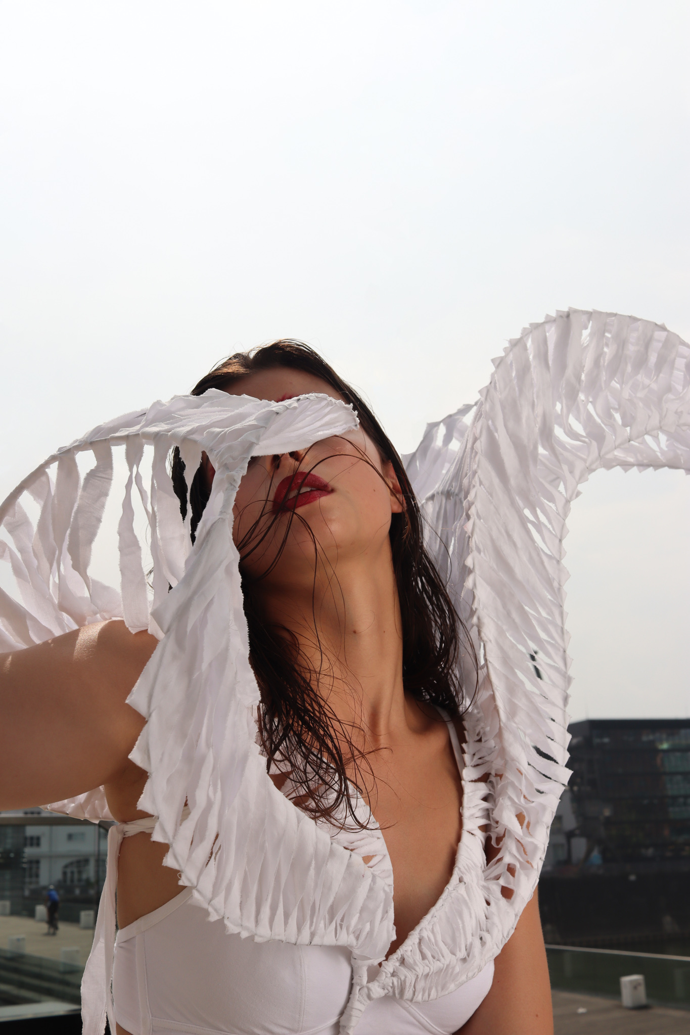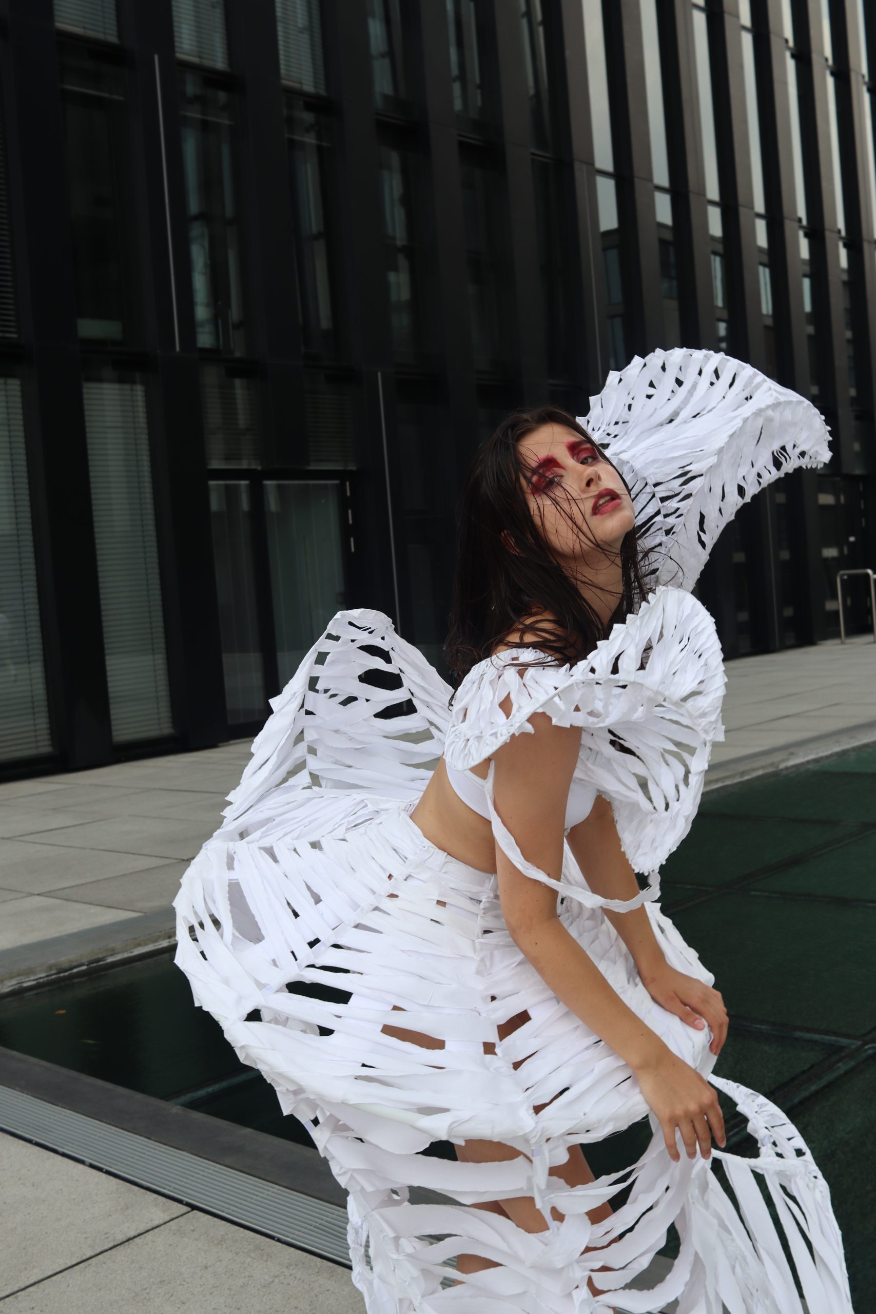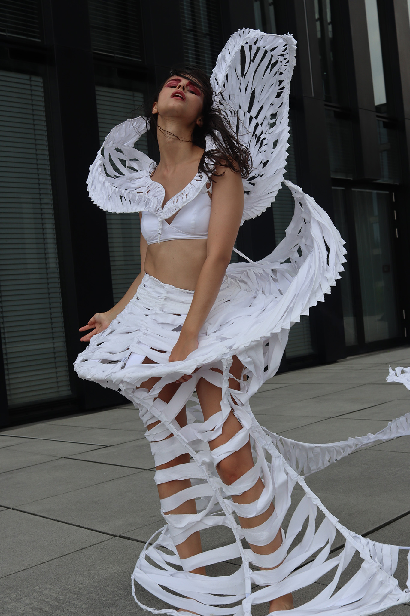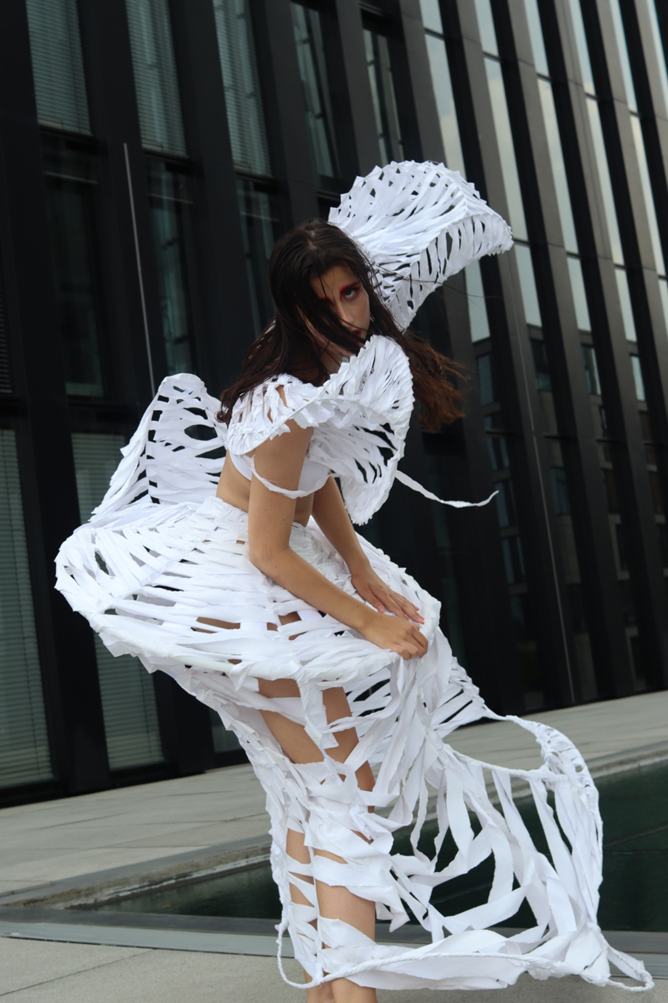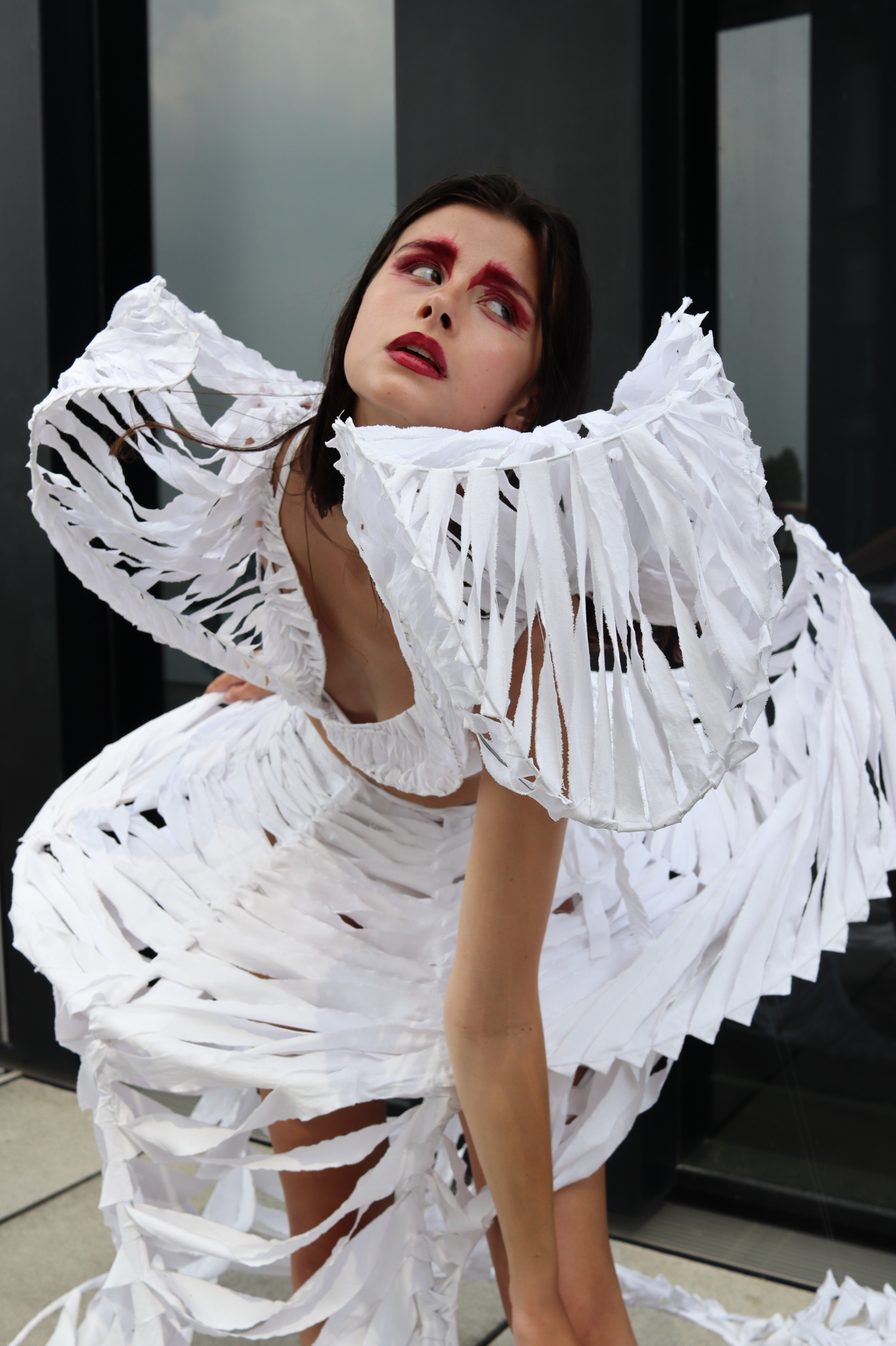 In her first-semester project, Emma Bassols transformed donated upcycled bedsheets from hotels into an avant-garde piece. Drawing inspiration from the ‘Swan Lake’ tale, she crafted this sculptural piece using a combination of a hula hoop, corset boning, and metal wires. The structure was then intricately covered with white cotton ribbons meticulously stripped from the repurposed bedsheets, and palced in the structure following a thoughtfully designed pattern.