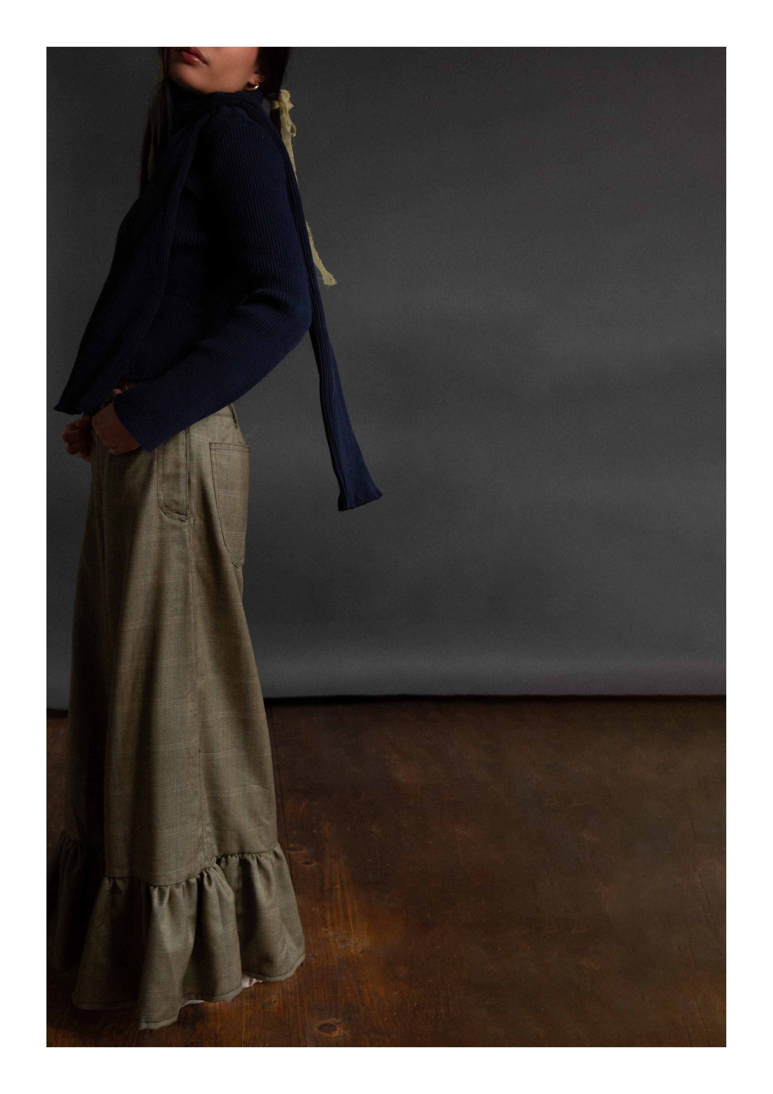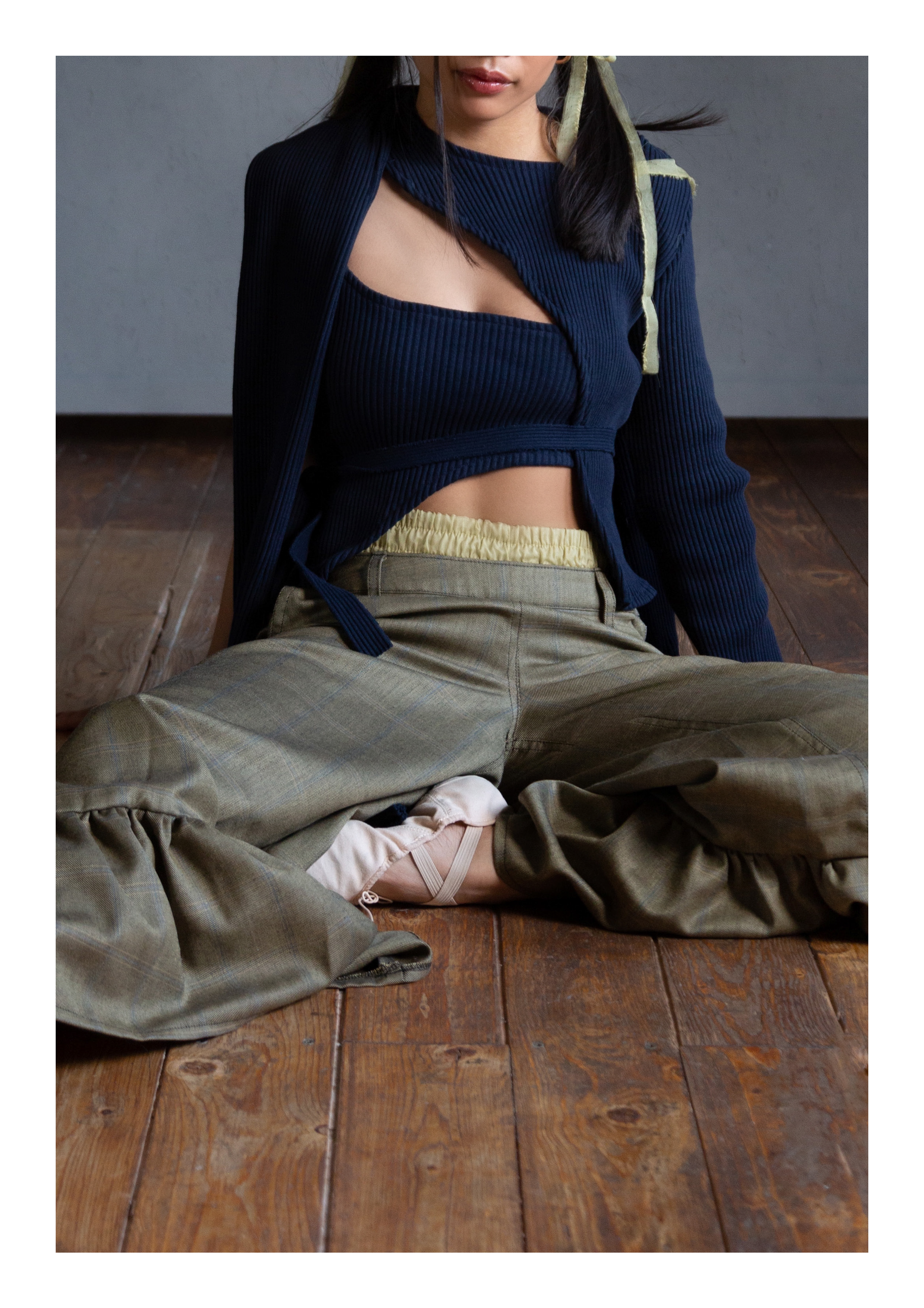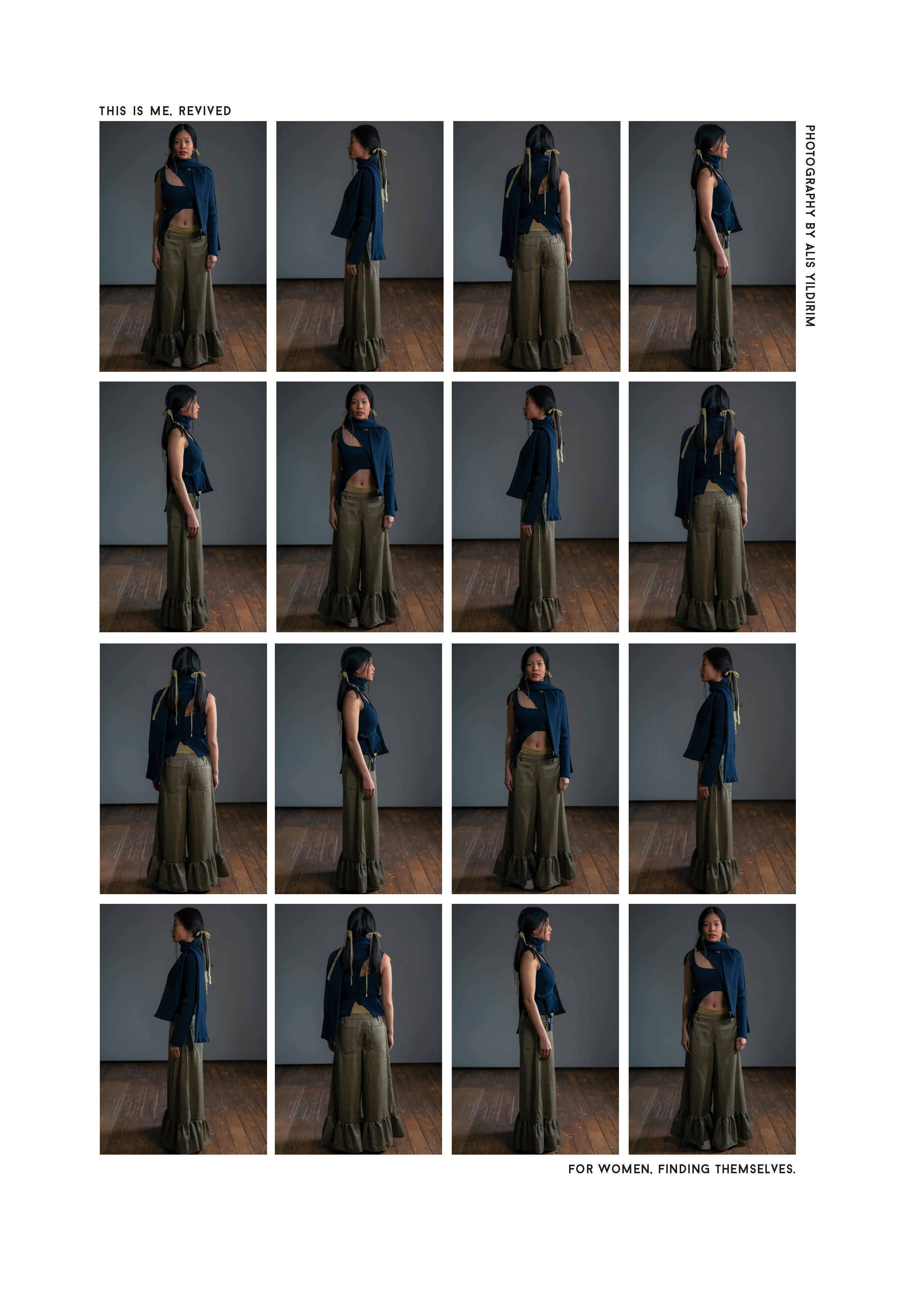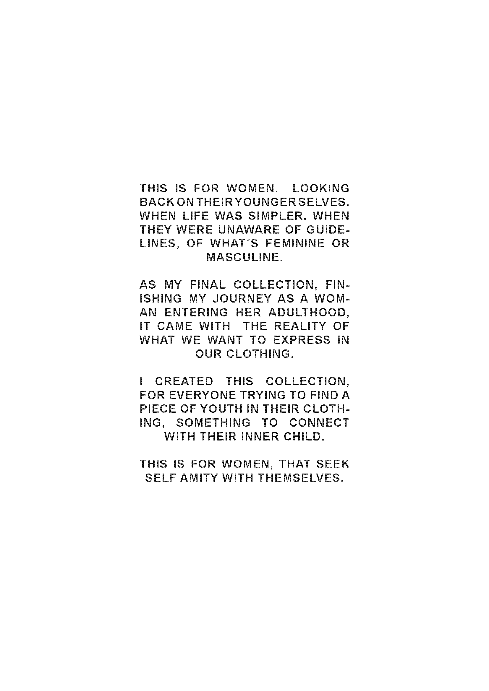 In her graduate collection, ‘Self-Amity,’ Emma marks the culmination of her journey into adulthood as a woman. The collection is a testament to her desire to offer attire that resonates with a sense of youth, establishing a connection with one’s inner child. Through ‘Self-Amity,’ Emma sought to seamlessly blend shapes and textures. Reflecting on her childhood, she identified inspiring characteristics in clothing and creatively integrated traditional ‘feminine’ and ‘masculine’ fashion elements. Designed for her 22-year-old self and her childhood self, ‘Self-Amity’ is an ode to those seeking a touch of youth in their wardrobe, fostering a connection with their inner child. It stands as a dedication to individuals yearning for self-harmony within.